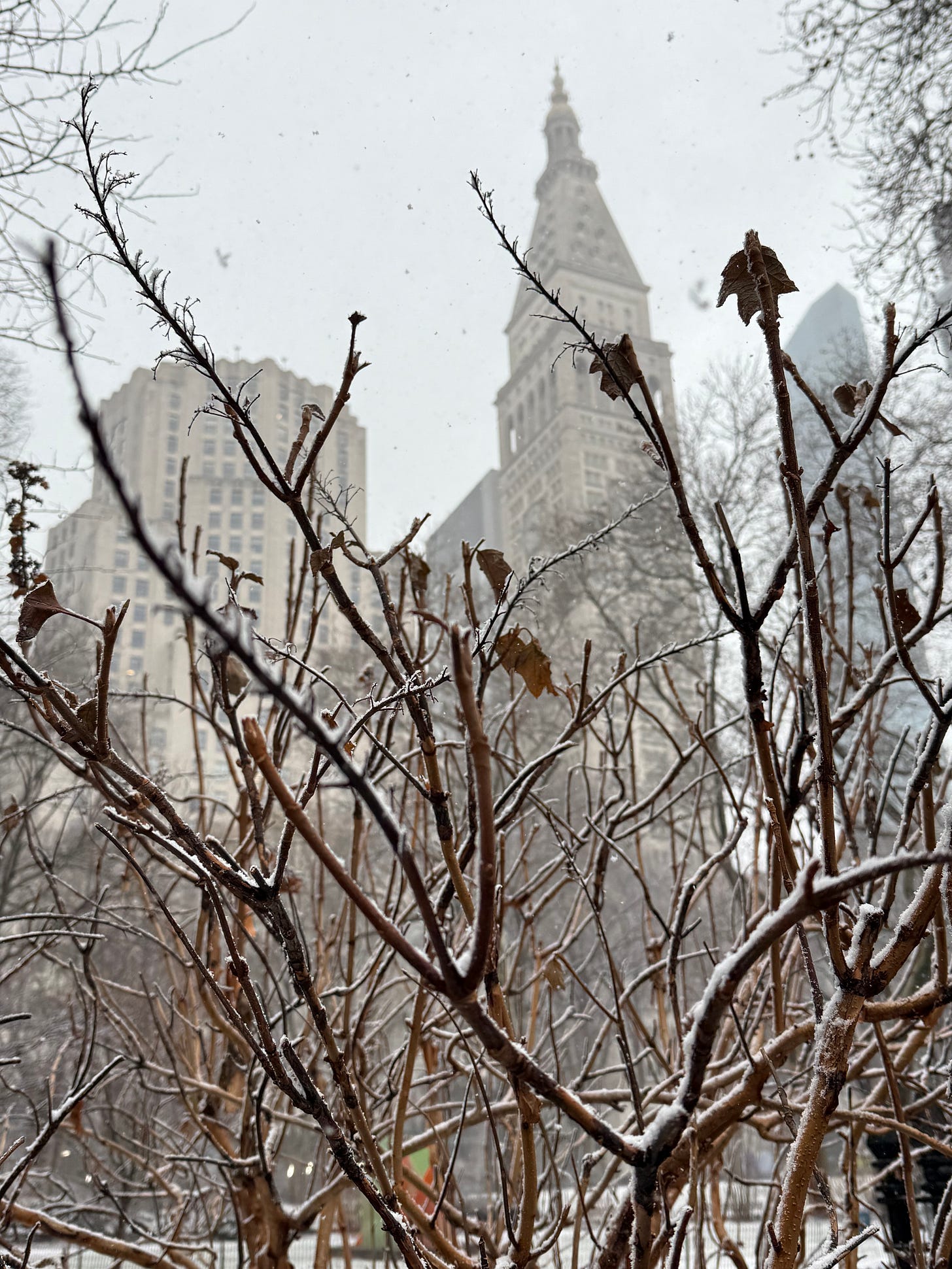 The image above: waiting on the big storm, waiting on the spring. This is from Madison Square Park, ringed by great old buildings, most housing insurance companies. So waiting on events, too, profits and losses totted up over time, neat ledgers ticking off investments, deaths, benefits, the meaningful rendered as banal and in an impoverished if monetary sense precisely as possible. Expectancies, hopes, anxieties, downright fears, living in the possible future as opposed to the experienced now, the human’s pride and curse I guess. Plants probably have it easier, in this regard at least.