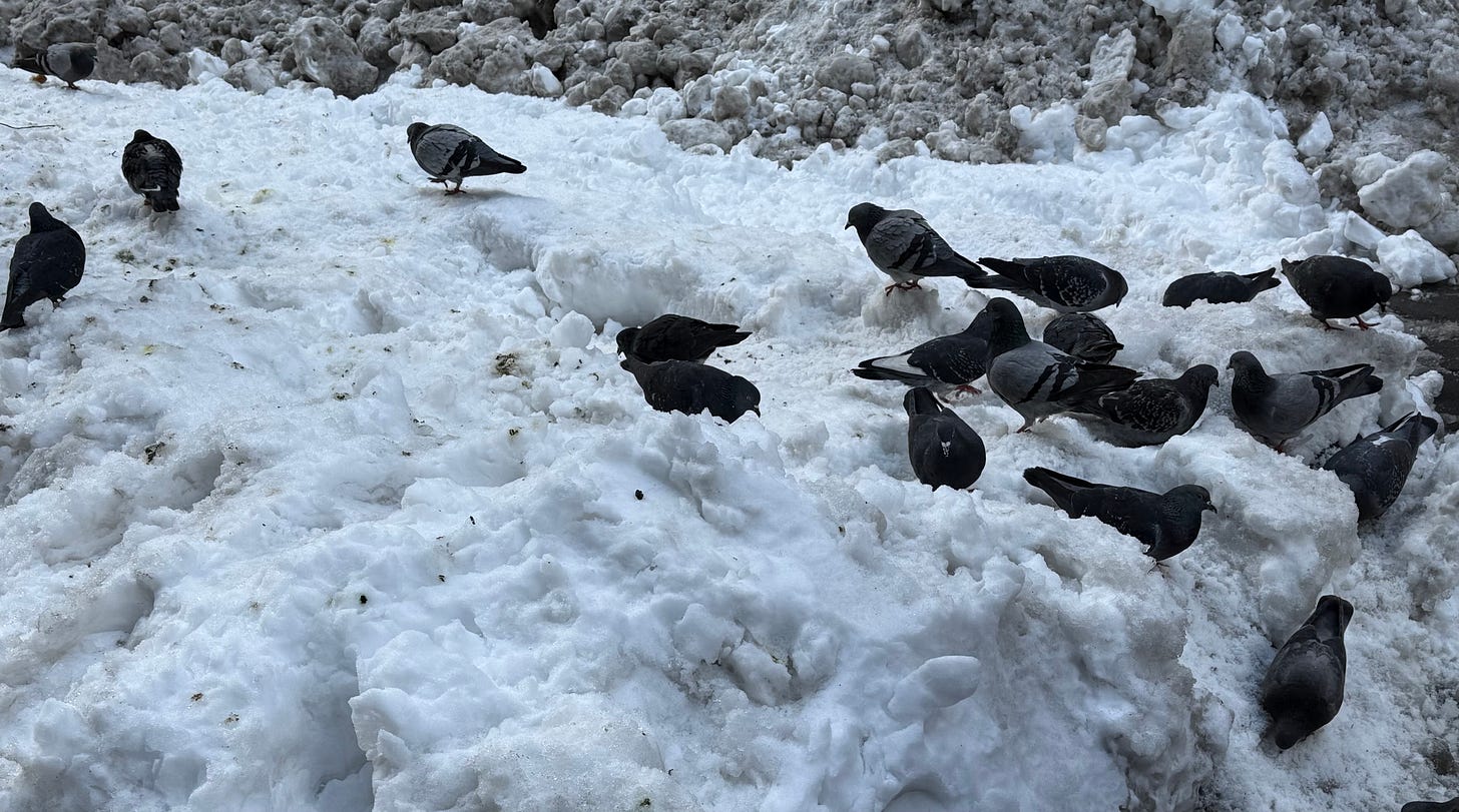 Pigeons on the glacier. Everybody has to try to survive. The pigeons huddle up in cold weather, often low. On my walks, I hear them cooing, sometimes before I see them. Harmoniously, but also counterpoint. Seems like a metaphor. Maybe an inspiration.