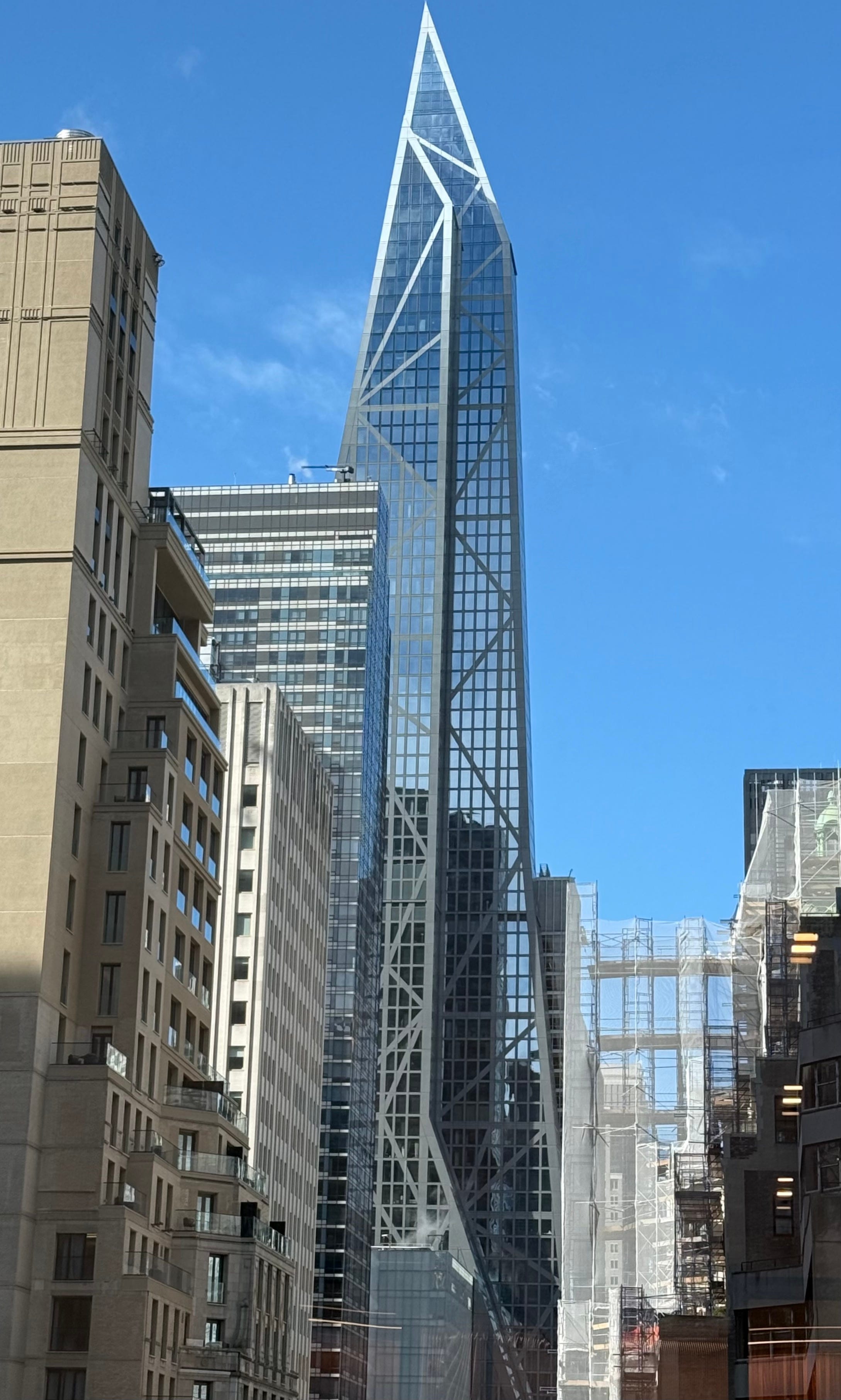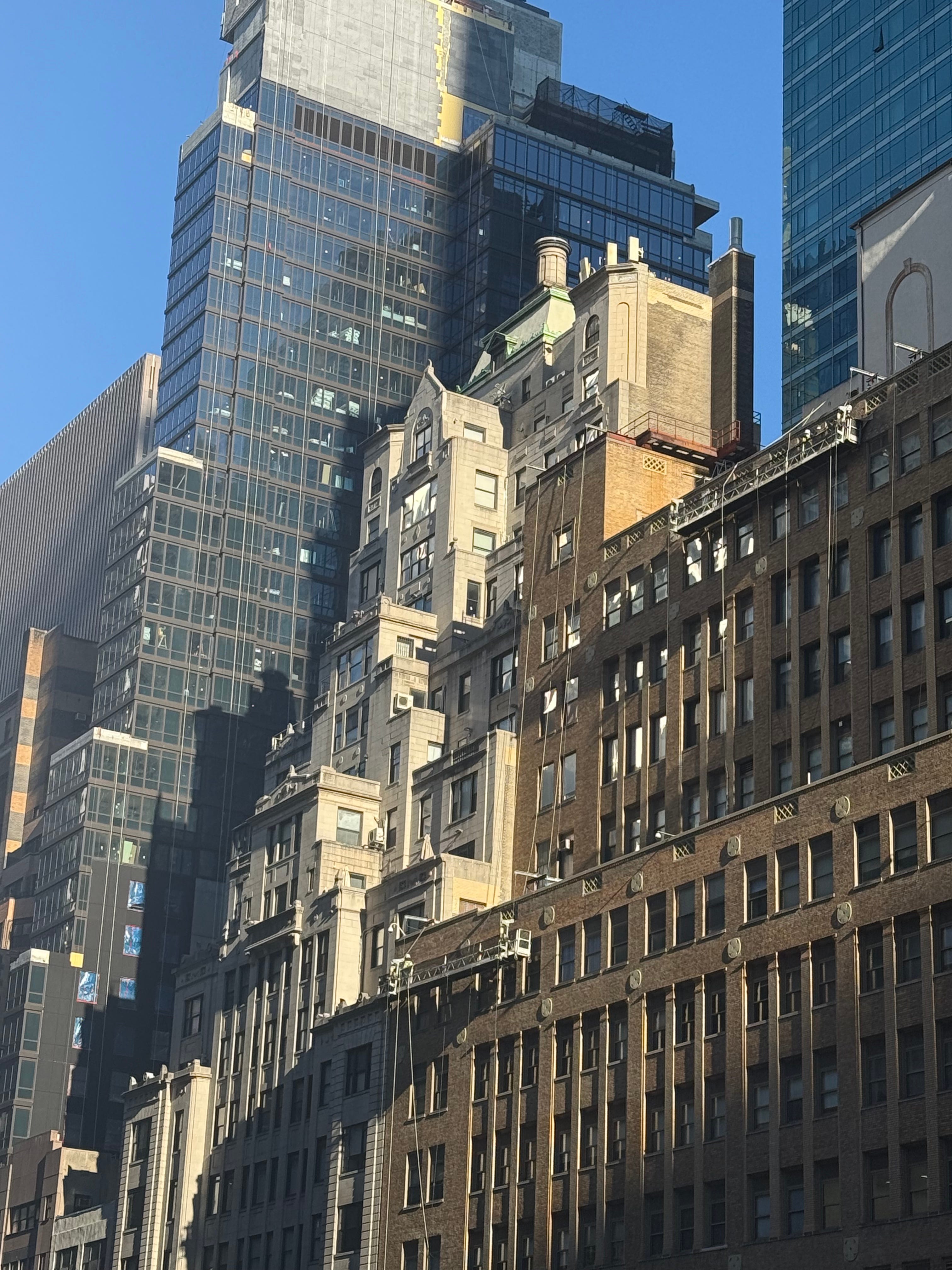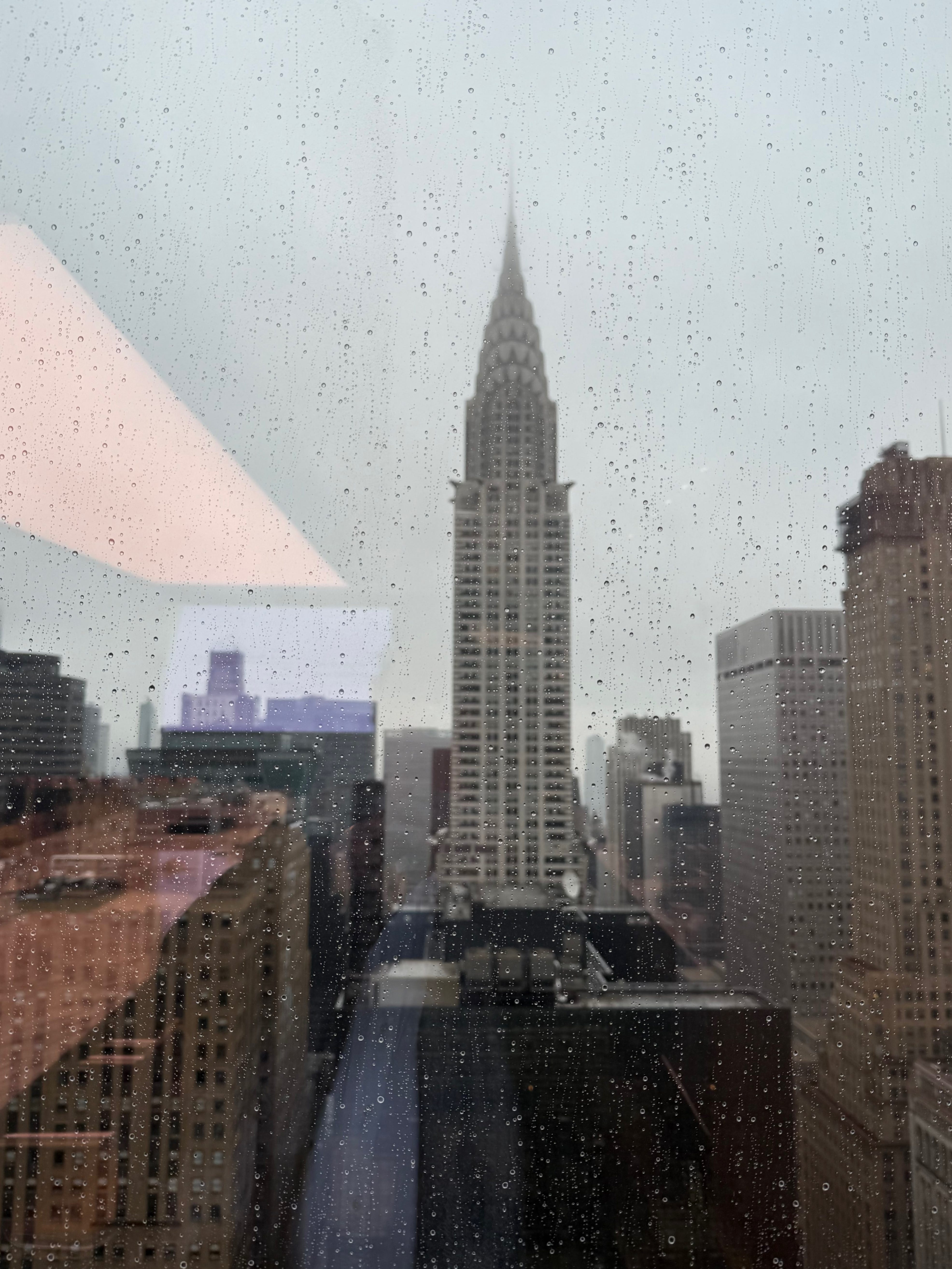 Perhaps the prettiest of all skyscrapers. Photographed from a conference room in One Vanderbilt (2020), named afterCornelius Vanderbilt (1794-1877). The view is over Grand Central Terminal (1913, on site of older stations). So we have centuries of capitalism, aspirations, vanities, sins, security of various sorts, and even generosities, and astonishing amounts of cumulative collective work. A synechdoche for a civilization. Perhaps one has to have been a corporate lawyer or the like, but the raindrops and the reflections are as important to me as the subject. I also really like the masses, though it’s weird to take a reflection of a light to balance a building. I’m kind of in love with this image, as you can tell. Mostly luck.
